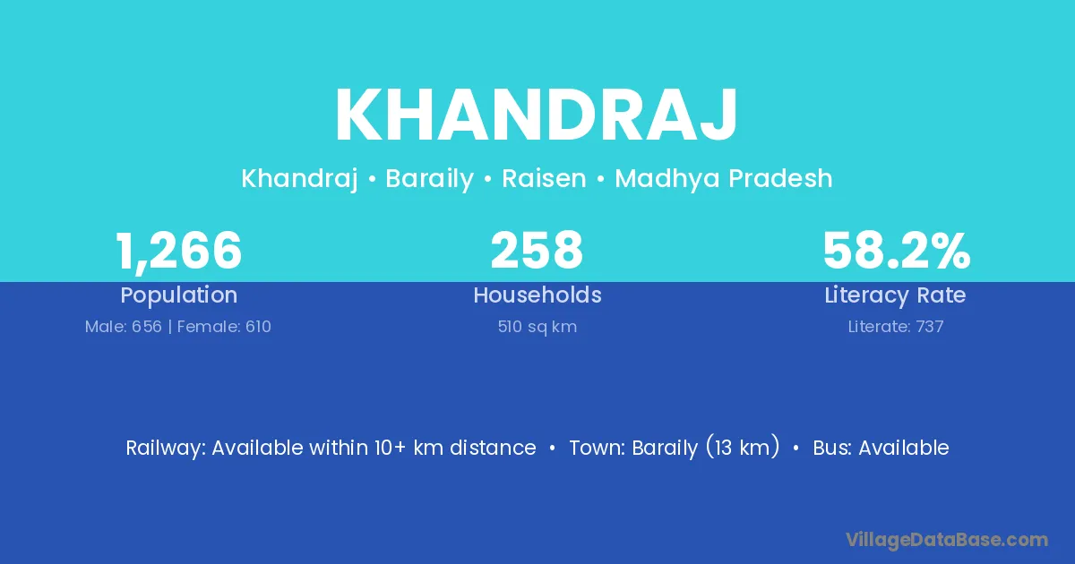 Baraily (13 km) is the nearest town to Khandraj village for major economic activities and is located approximately 13 km away.
