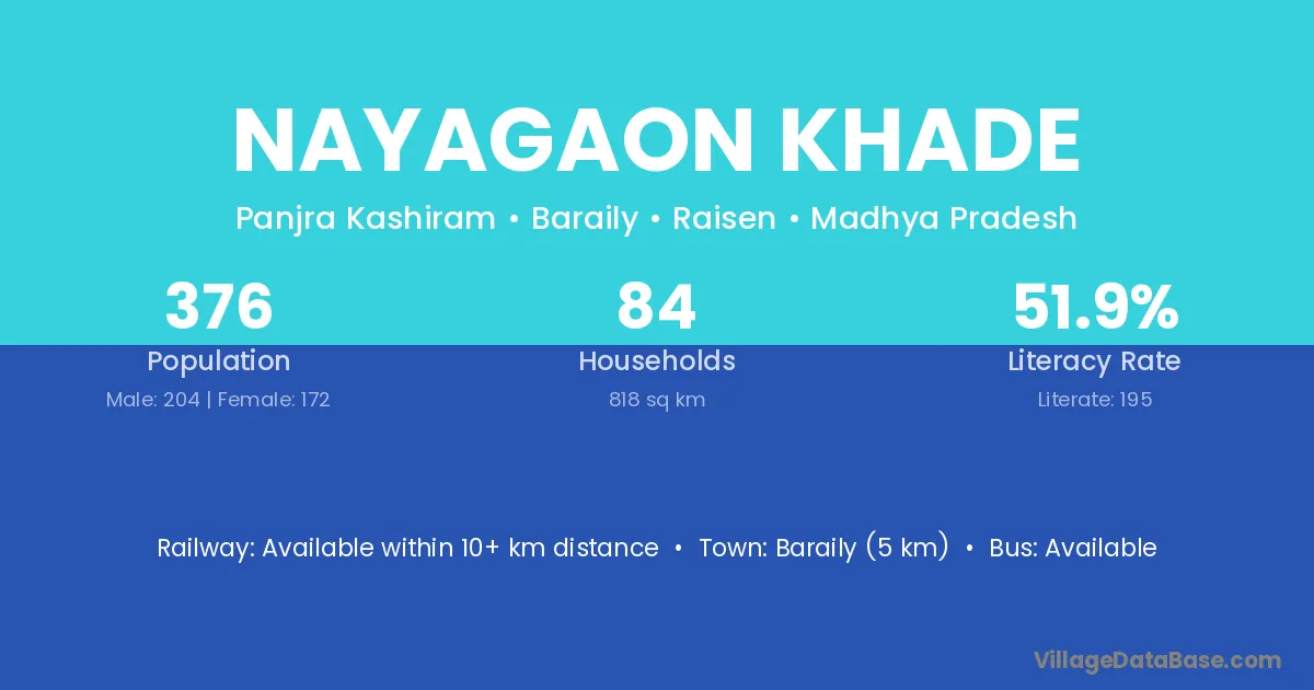 Baraily (5 km) is the nearest town to Nayagaon Khade village for major economic activities and is located approximately 5 km away.