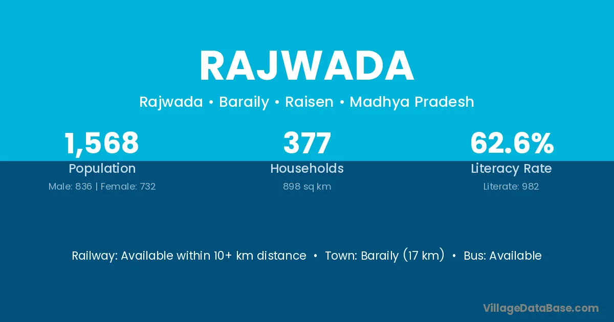 Baraily (17 km) is the nearest town to Rajwada village for major economic activities and is located approximately 17 km away.