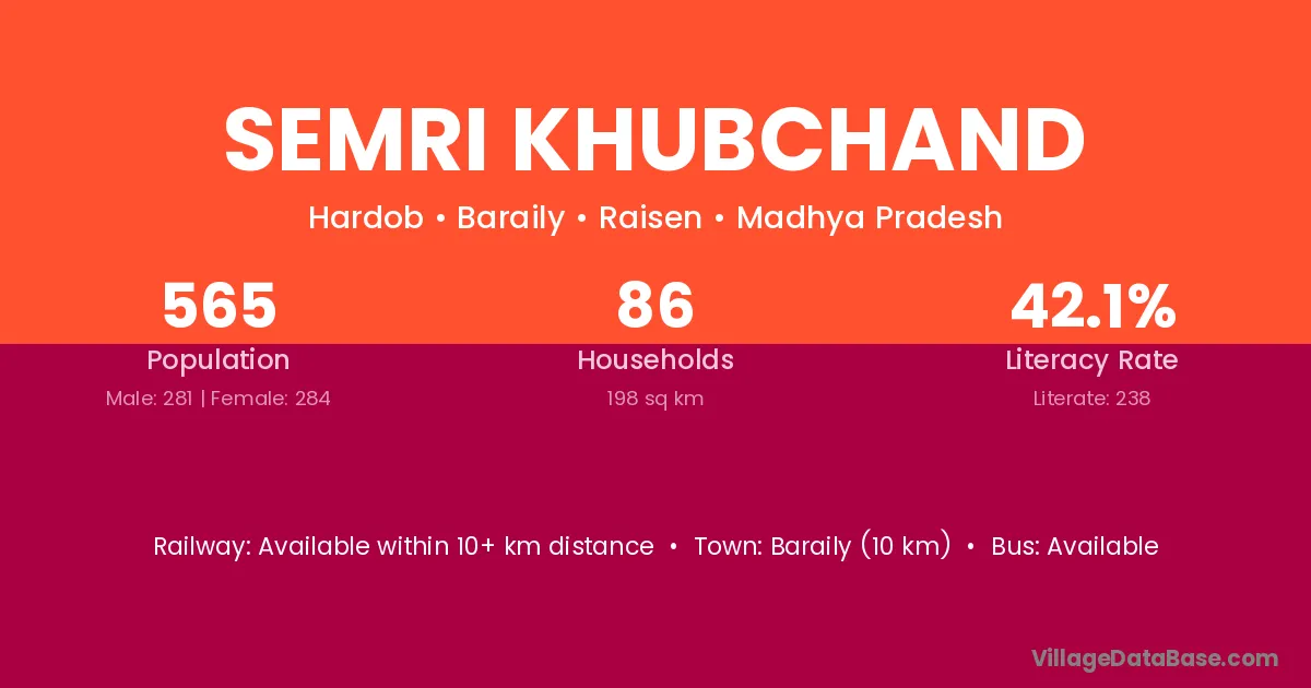 Baraily (10 km) is the nearest town to Semri Khubchand village for major economic activities and is located approximately 10 km away.