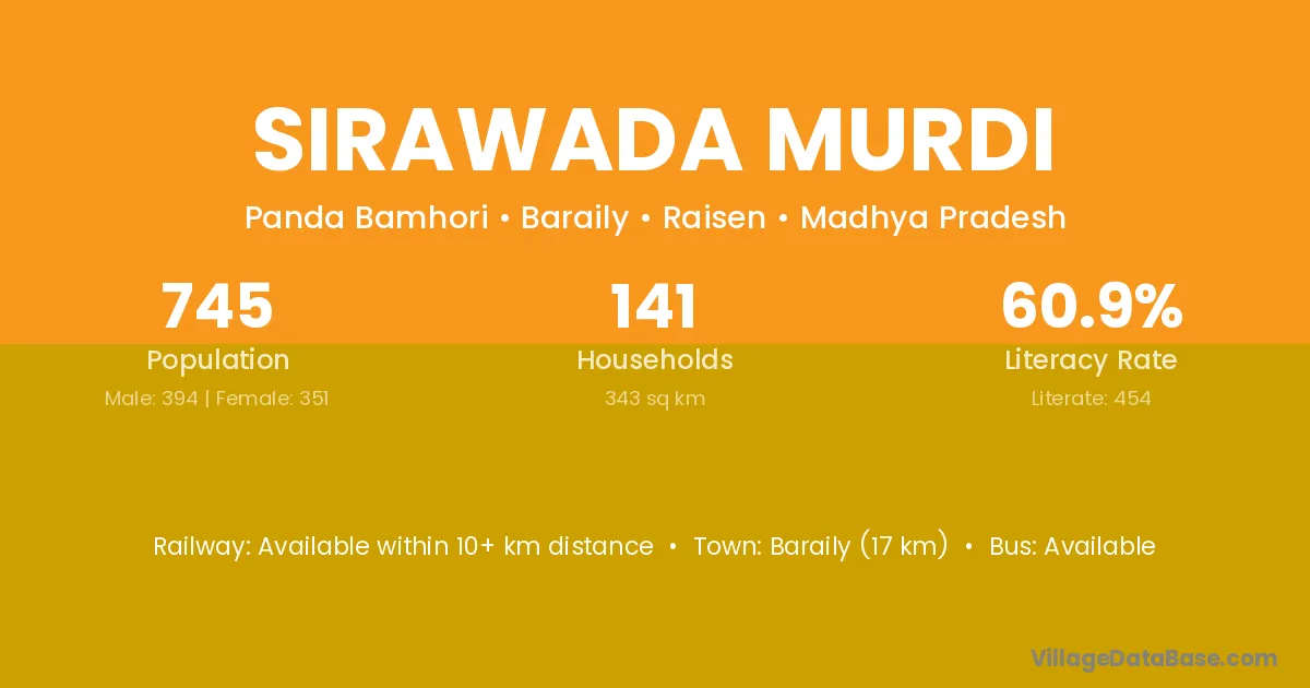 Baraily (17 km) is the nearest town to Sirawada Murdi village for major economic activities and is located approximately 17 km away.