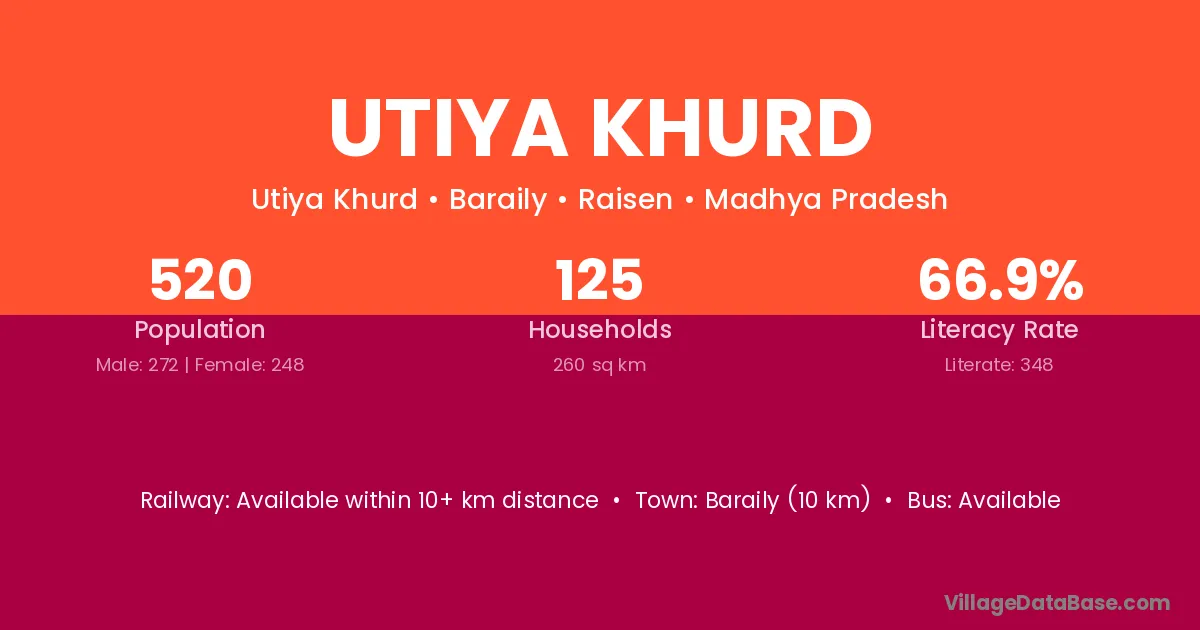 Baraily (10 km) is the nearest town to Utiya Khurd village for major economic activities and is located approximately 10 km away.