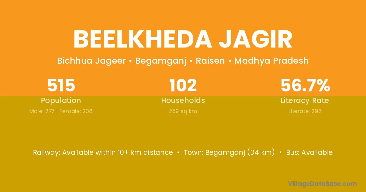 Begamganj (34 km) is the nearest town to Beelkheda Jagir village for major economic activities and is located approximately 34 km away.