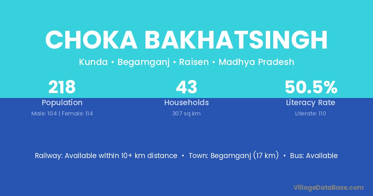 Choka Bakhatsingh village has a total population of 218 people, of which 104 are males and 114 are females.