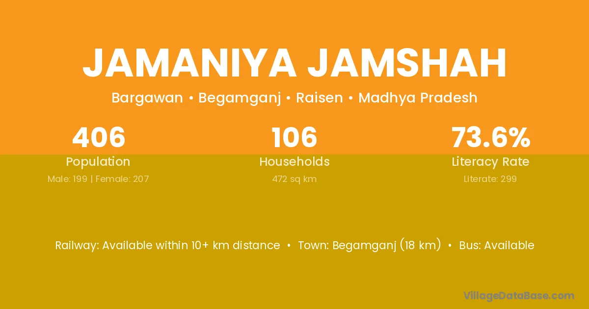 Begamganj (18 km) is the nearest town to Jamaniya Jamshah village for major economic activities and is located approximately 18 km away.