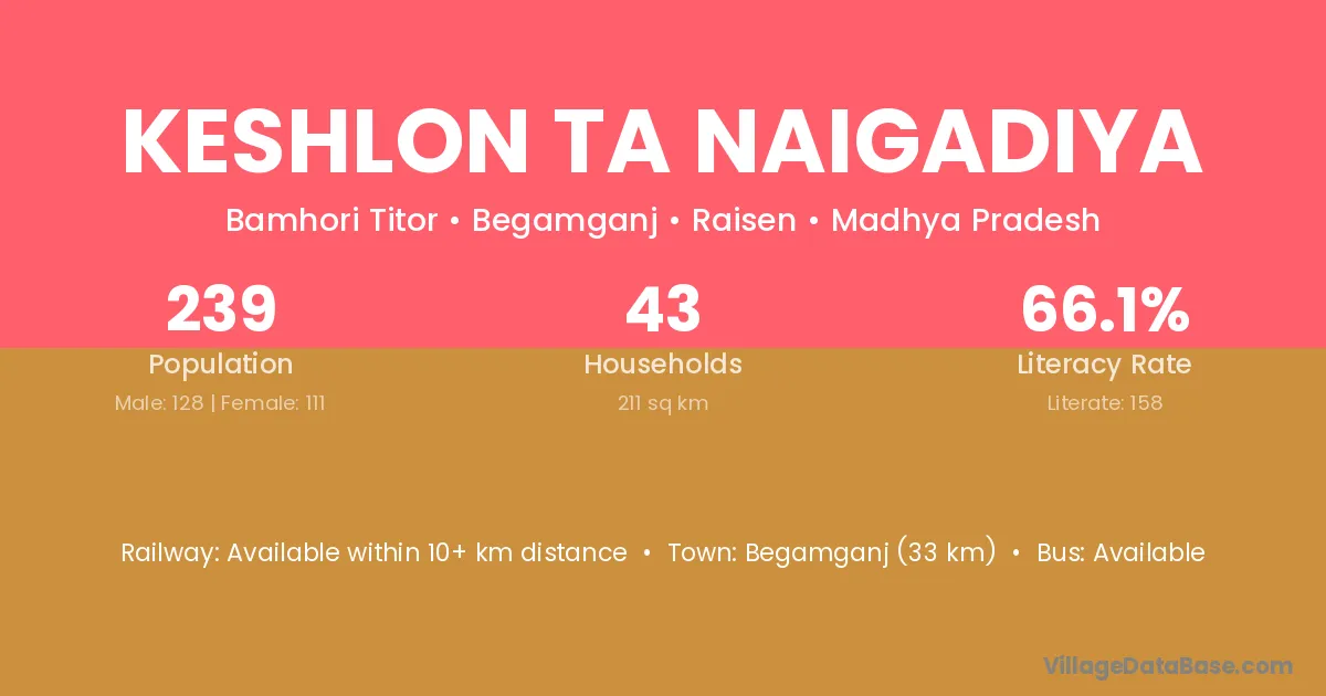 Begamganj (33 km) is the nearest town to Keshlon Ta Naigadiya village for major economic activities and is located approximately 33 km away.
