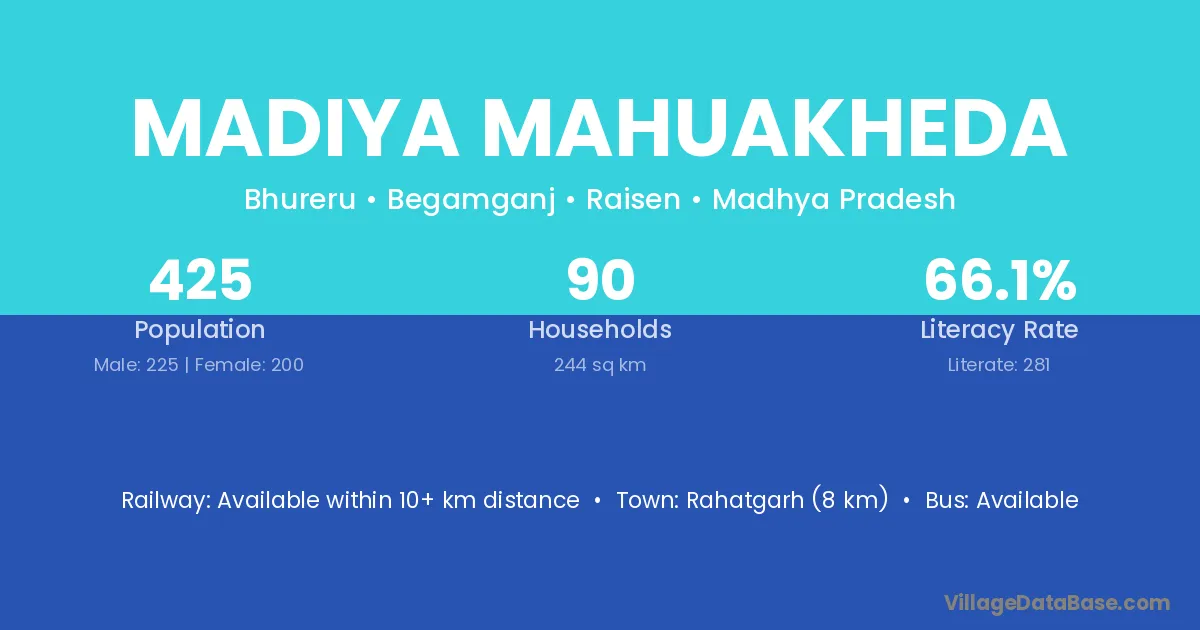 Rahatgarh (8 km) is the nearest town to Madiya Mahuakheda village for major economic activities and is located approximately 8 km away.