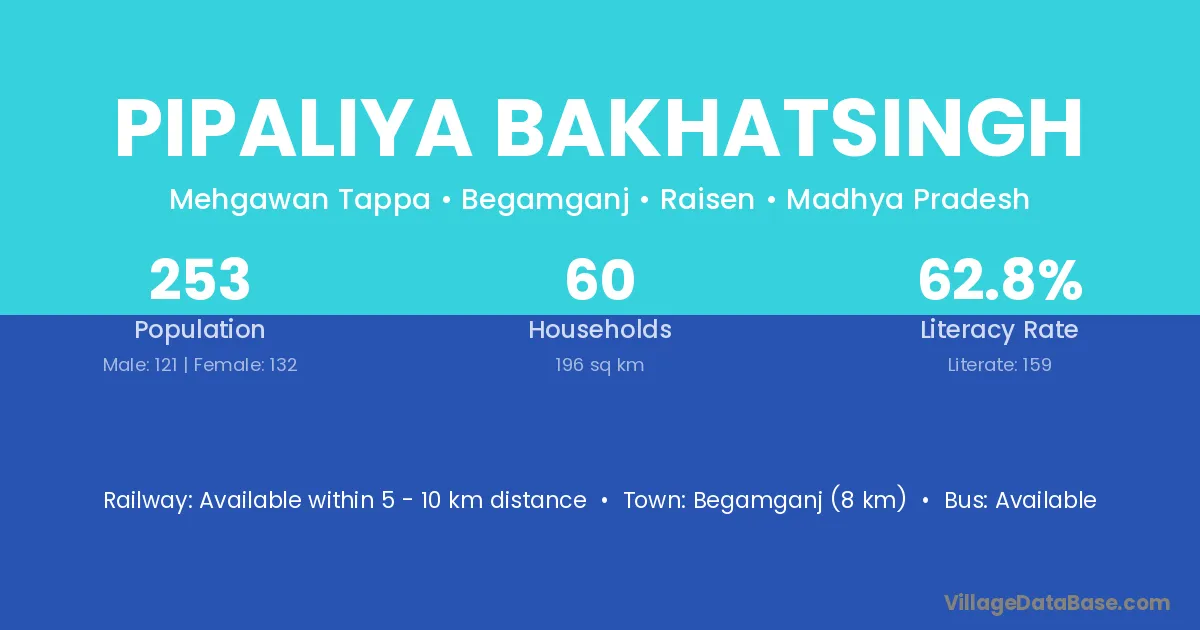 Begamganj (8 km) is the nearest town to Pipaliya Bakhatsingh village for major economic activities and is located approximately 8 km away.