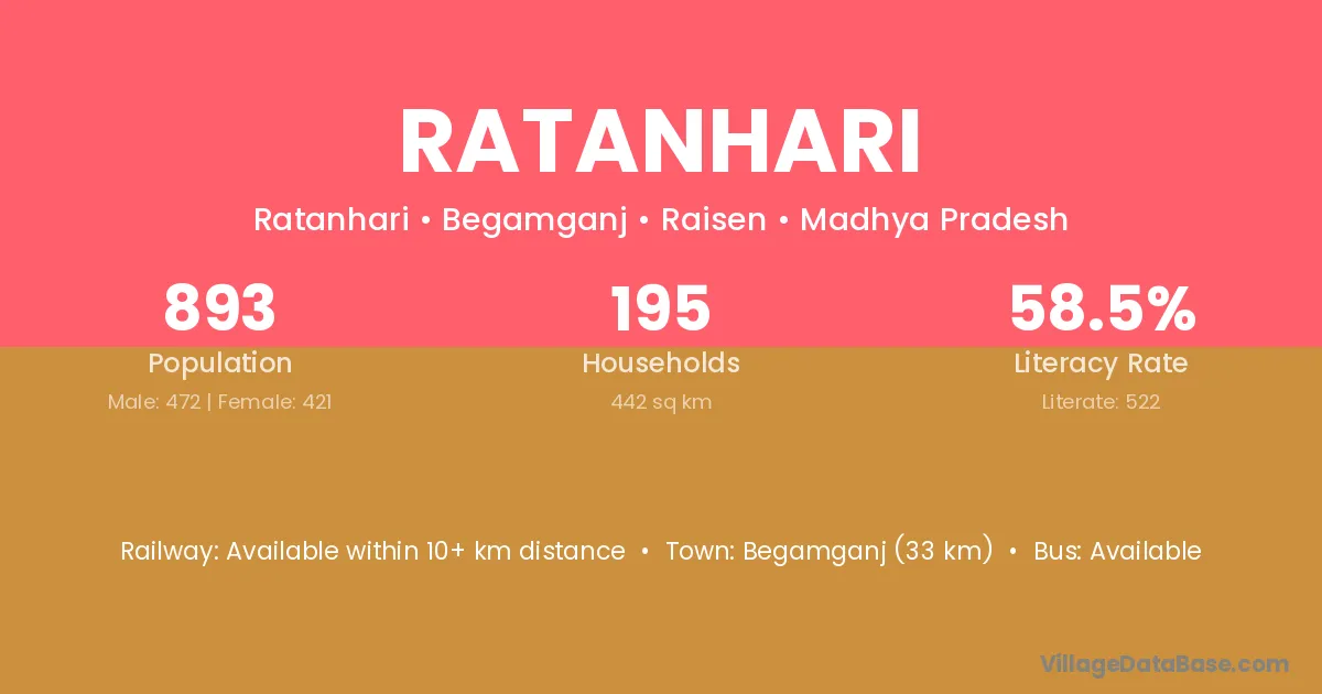 Begamganj (33 km) is the nearest town to Ratanhari village for major economic activities and is located approximately 33 km away.