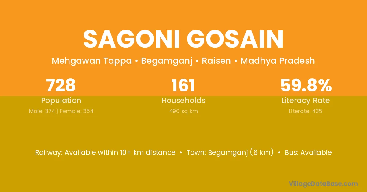 Begamganj (6 km) is the nearest town to Sagoni Gosain village for major economic activities and is located approximately 6 km away.