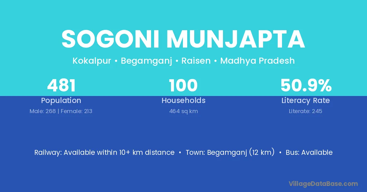 Begamganj (12 km) is the nearest town to Sogoni Munjapta village for major economic activities and is located approximately 12 km away.