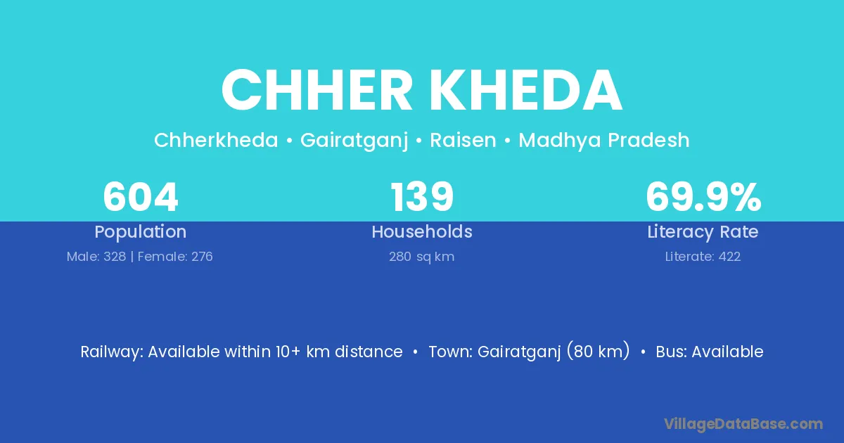 Chher Kheda village has a total population of 604 people, of which 328 are males and 276 are females.