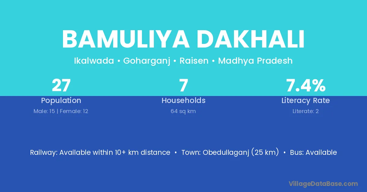 Obedullaganj (25 km) is the nearest town to Bamuliya Dakhali village for major economic activities and is located approximately 25 km away.