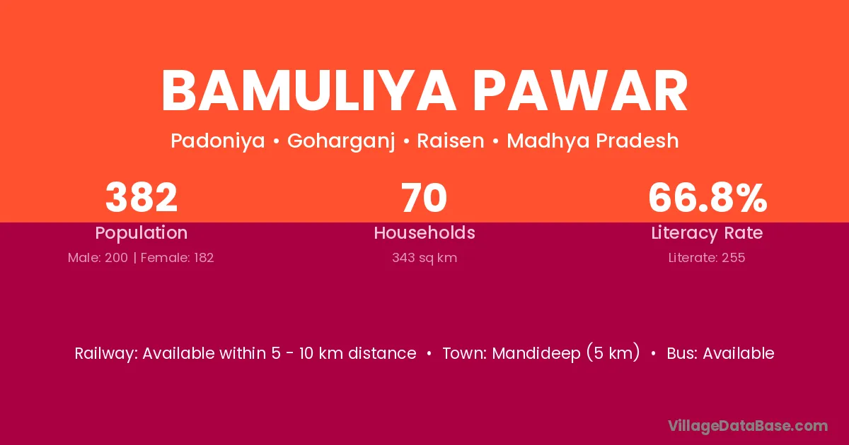 Bamuliya Pawar village has a total population of 382 people, of which 200 are males and 182 are females.