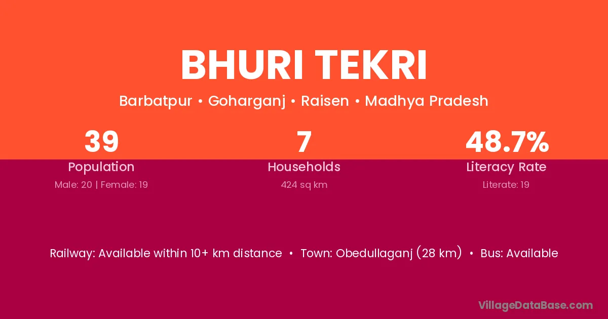 Obedullaganj (28 km) is the nearest town to Bhuri Tekri village for major economic activities and is located approximately 28 km away.