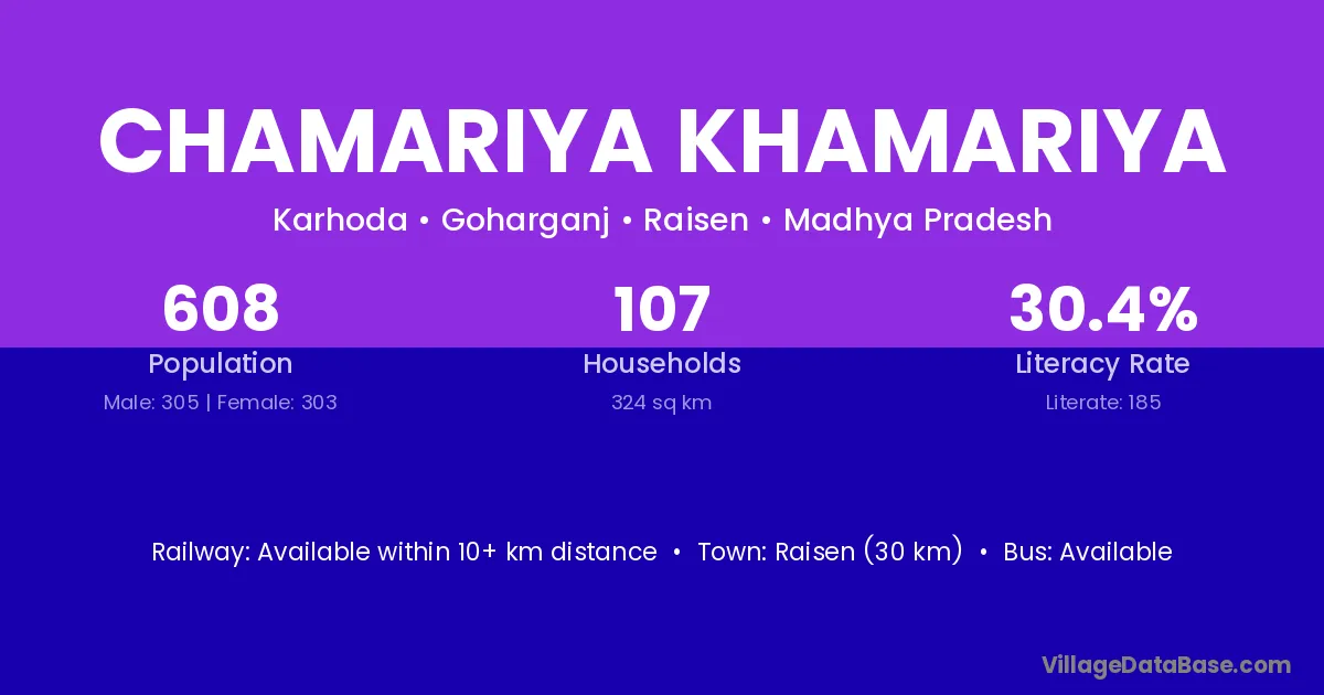 Raisen (30 km) is the nearest town to Chamariya Khamariya village for major economic activities and is located approximately 30 km away.