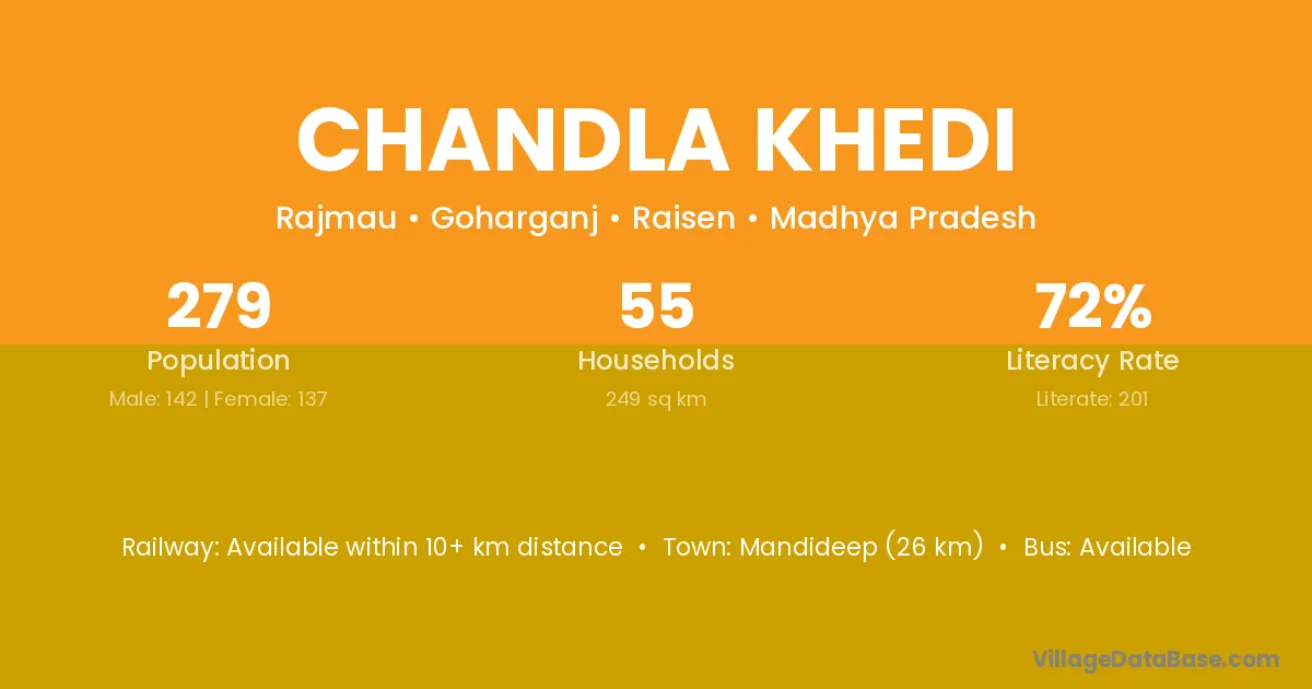 Chandla Khedi village has a total population of 279 people, of which 142 are males and 137 are females.