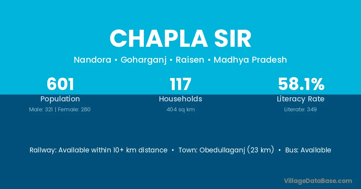 Obedullaganj (23 km) is the nearest town to Chapla Sir village for major economic activities and is located approximately 23 km away.