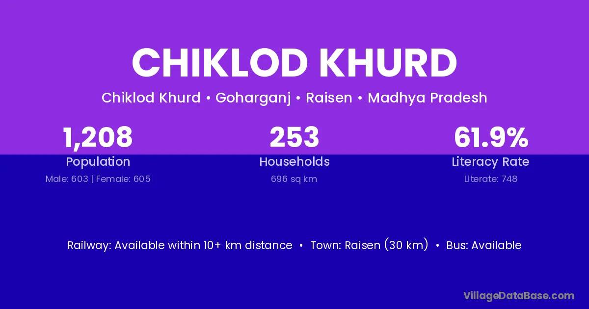Raisen (30 km) is the nearest town to Chiklod Khurd village for major economic activities and is located approximately 30 km away.