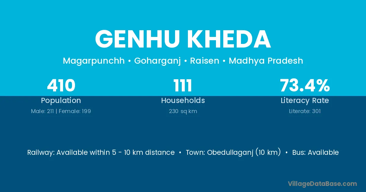 Obedullaganj (10 km) is the nearest town to Genhu Kheda village for major economic activities and is located approximately 10 km away.
