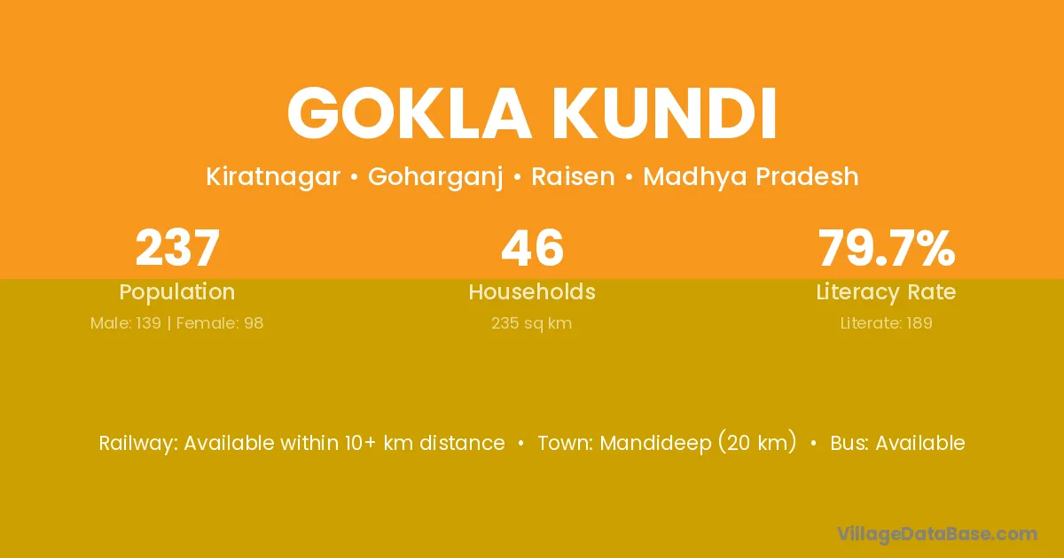 Mandideep (20 km) is the nearest town to Gokla Kundi village for major economic activities and is located approximately 20 km away.