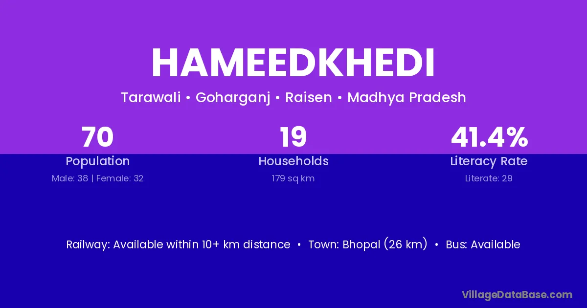 Hameedkhedi village has a total population of 70 people, of which 38 are males and 32 are females.