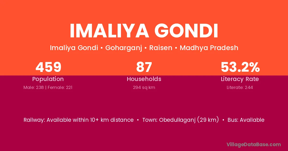 Obedullaganj (29 km) is the nearest town to Imaliya Gondi village for major economic activities and is located approximately 29 km away.