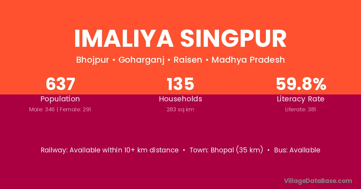 Bhopal (35 km) is the nearest town to Imaliya Singpur village for major economic activities and is located approximately 35 km away.
