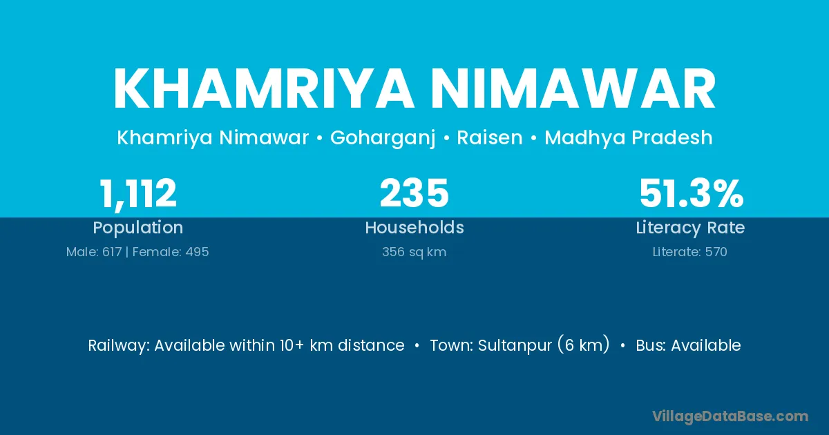 Khamriya Nimawar village has a total population of 1,112 people, of which 617 are males and 495 are females.