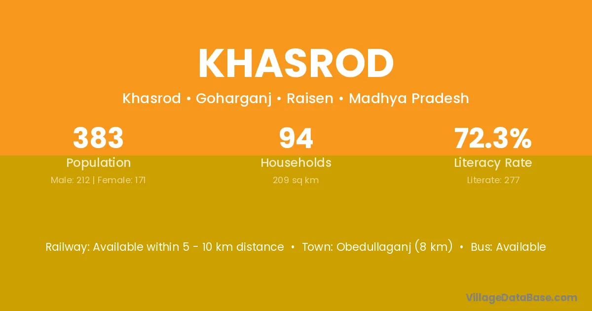 Obedullaganj (8 km) is the nearest town to Khasrod village for major economic activities and is located approximately 8 km away.