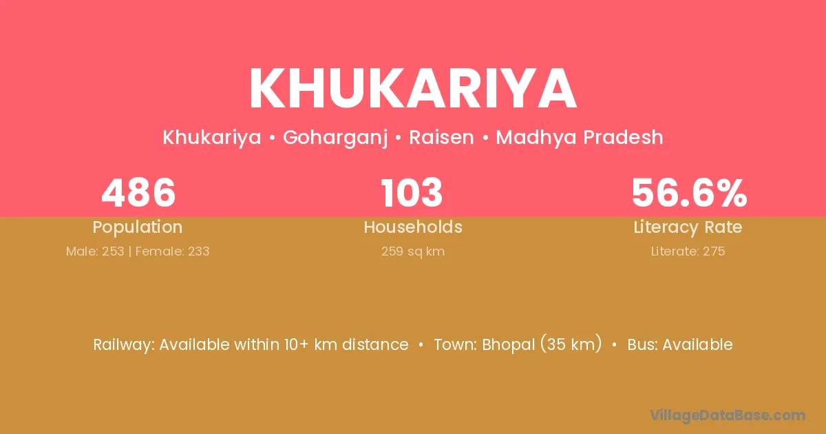 Bhopal (35 km) is the nearest town to Khukariya village for major economic activities and is located approximately 35 km away.