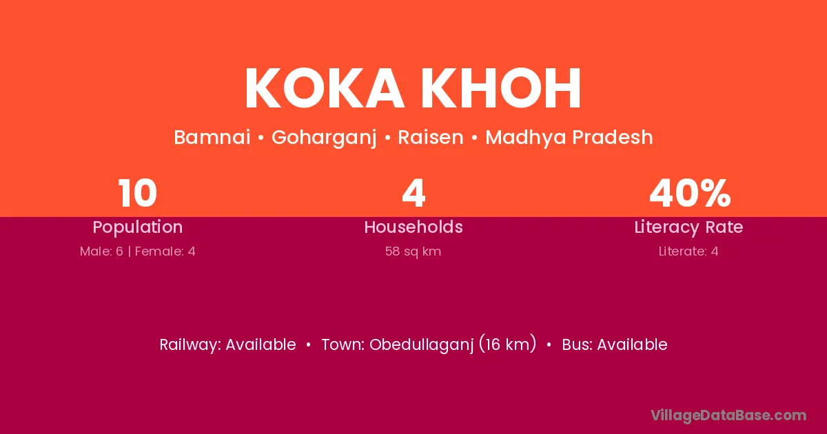 Obedullaganj (16 km) is the nearest town to Koka Khoh village for major economic activities and is located approximately 16 km away.