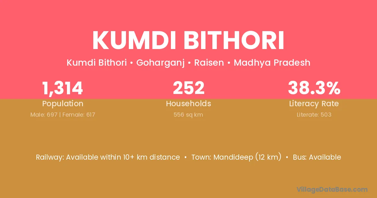 Mandideep (12 km) is the nearest town to Kumdi Bithori village for major economic activities and is located approximately 12 km away.