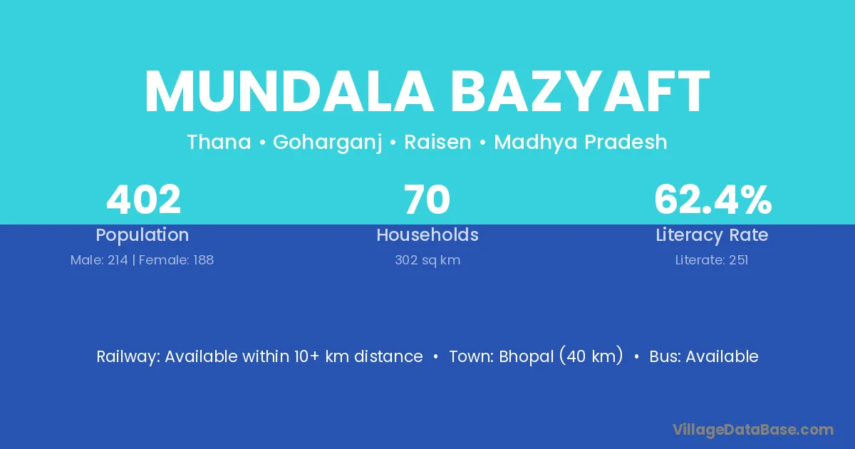 Bhopal (40 km) is the nearest town to Mundala Bazyaft village for major economic activities and is located approximately 40 km away.