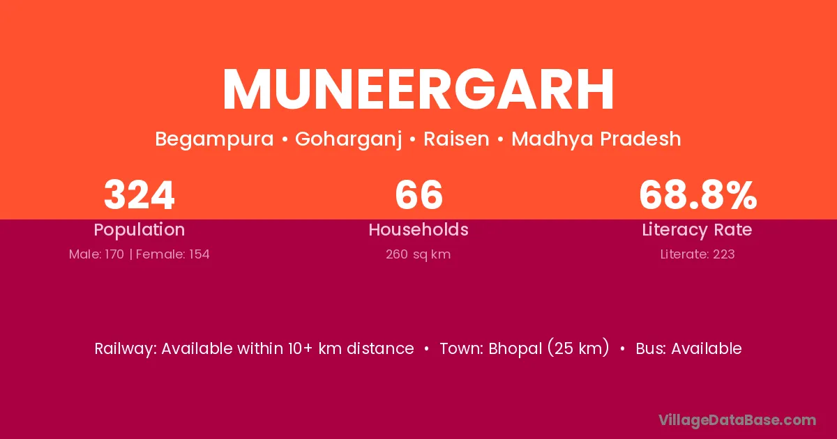 Bhopal (25 km) is the nearest town to Muneergarh village for major economic activities and is located approximately 25 km away.