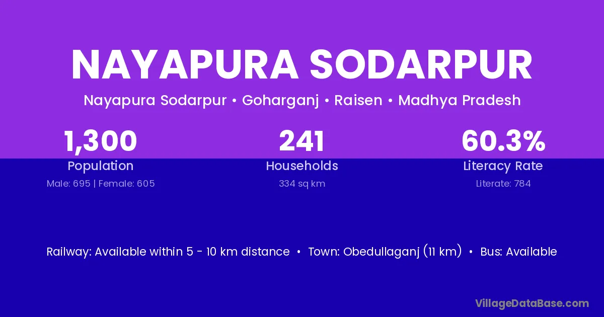 Obedullaganj (11 km) is the nearest town to Nayapura Sodarpur village for major economic activities and is located approximately 11 km away.