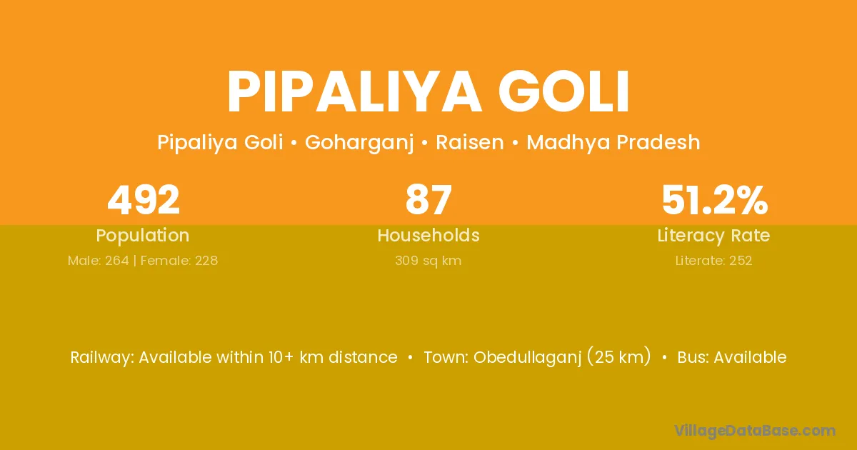 Obedullaganj (25 km) is the nearest town to Pipaliya Goli village for major economic activities and is located approximately 25 km away.