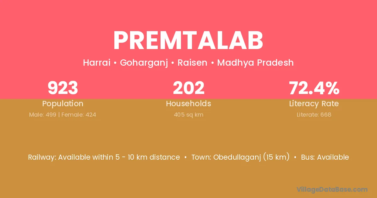 Obedullaganj (15 km) is the nearest town to Premtalab village for major economic activities and is located approximately 15 km away.