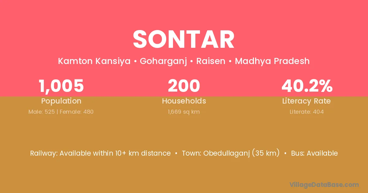 Obedullaganj (35 km) is the nearest town to Sontar village for major economic activities and is located approximately 35 km away.