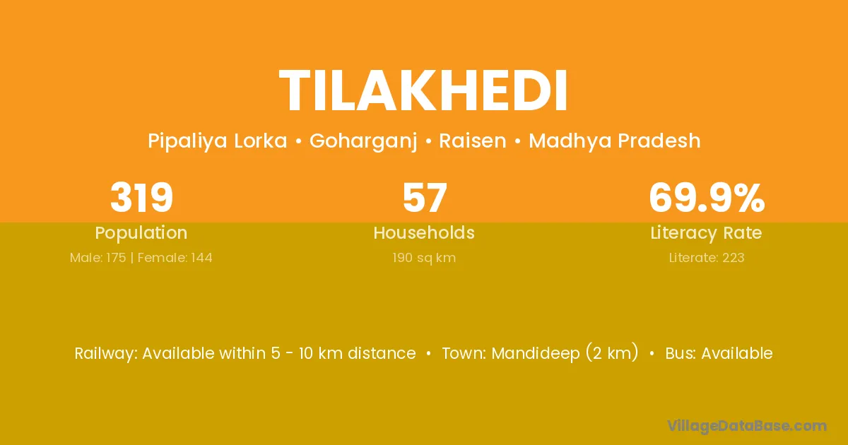 Tilakhedi village has a total population of 319 people, of which 175 are males and 144 are females.