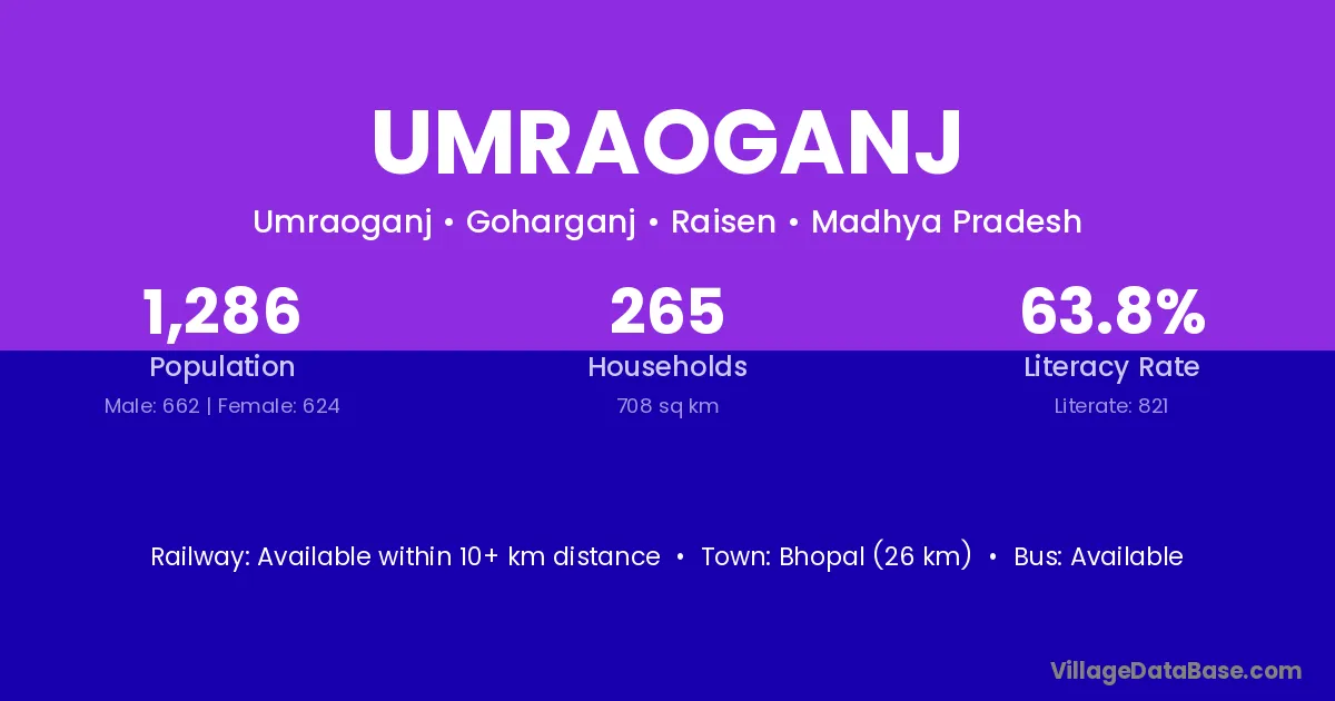 Bhopal (26 km) is the nearest town to Umraoganj village for major economic activities and is located approximately 26 km away.