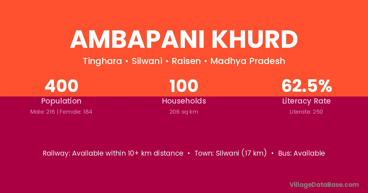 Silwani (17 km) is the nearest town to Ambapani Khurd village for major economic activities and is located approximately 17 km away.