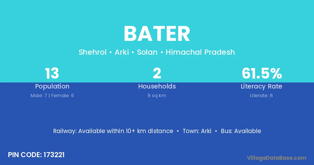 The literacy rate of Bater village is 69.29%. Male literacy stands at 77.22% and female literacy at 59.02%.