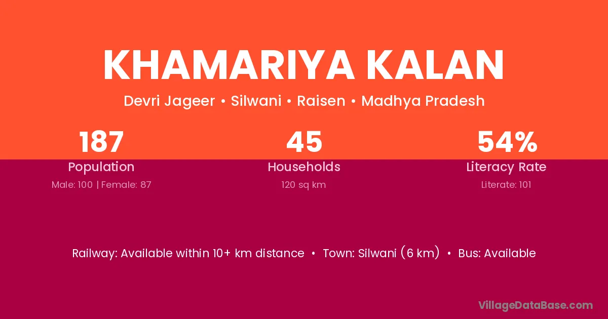 Silwani (6 km) is the nearest town to Khamariya Kalan village for major economic activities and is located approximately 6 km away.