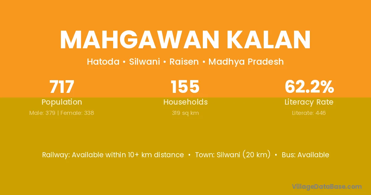 Silwani (20 km) is the nearest town to Mahgawan Kalan village for major economic activities and is located approximately 20 km away.