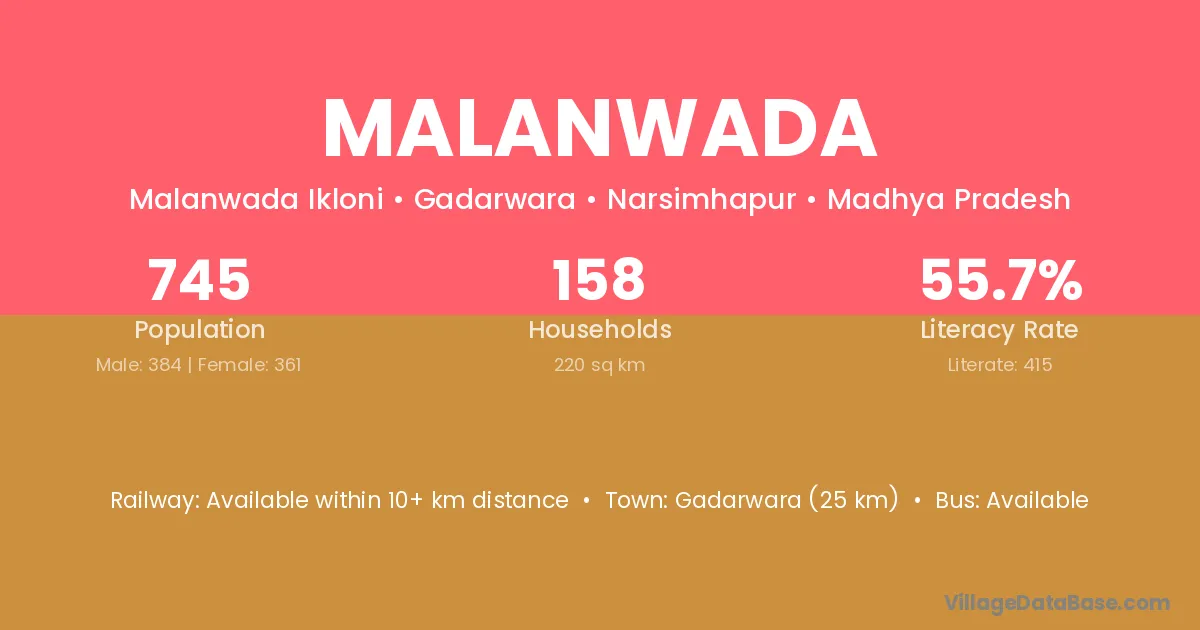 Baraily (21 km) is the nearest town to Malanwada village for major economic activities and is located approximately 21 km away.