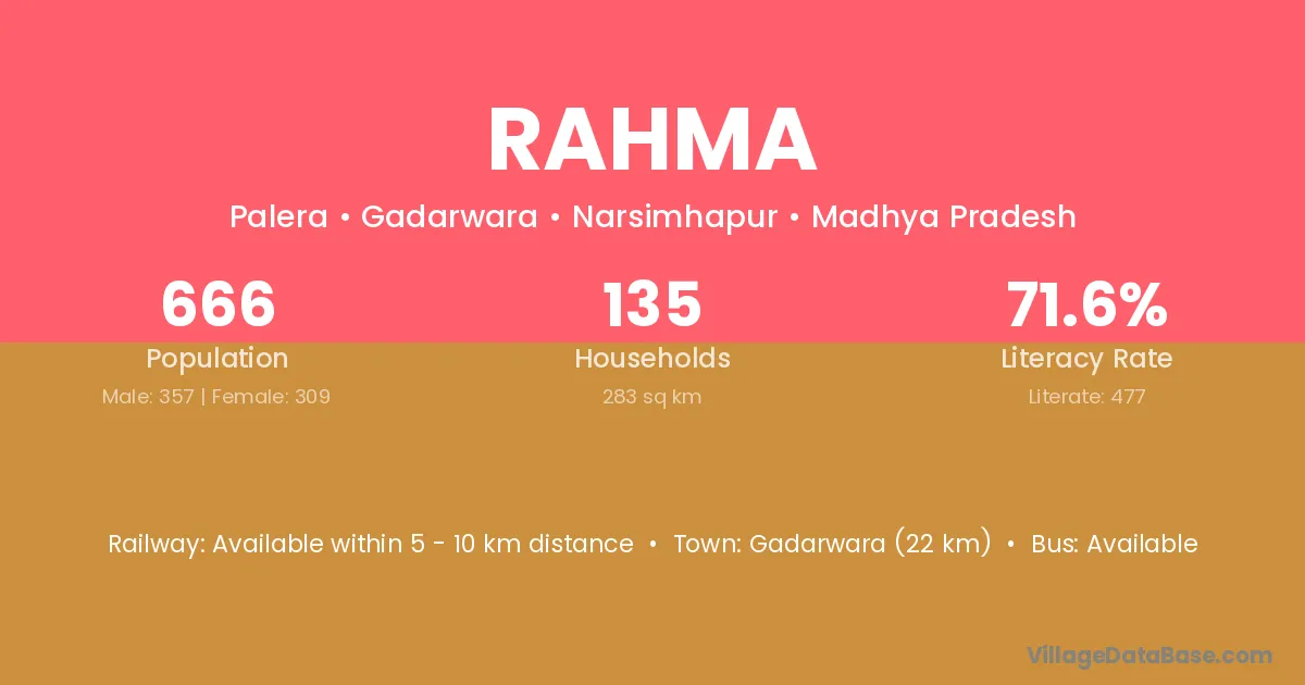 The literacy rate of Rahma village is 66.55%. Male literacy stands at 74.10% and female literacy at 59.23%.