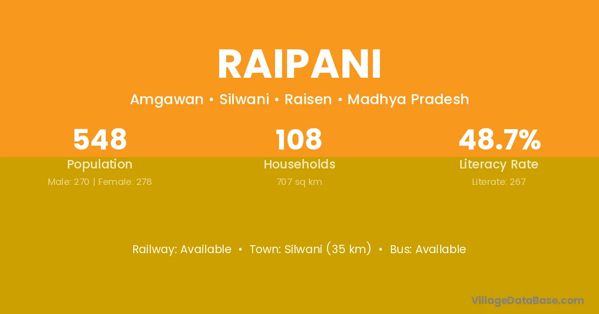 Silwani (35 km) is the nearest town to Raipani village for major economic activities and is located approximately 35 km away.