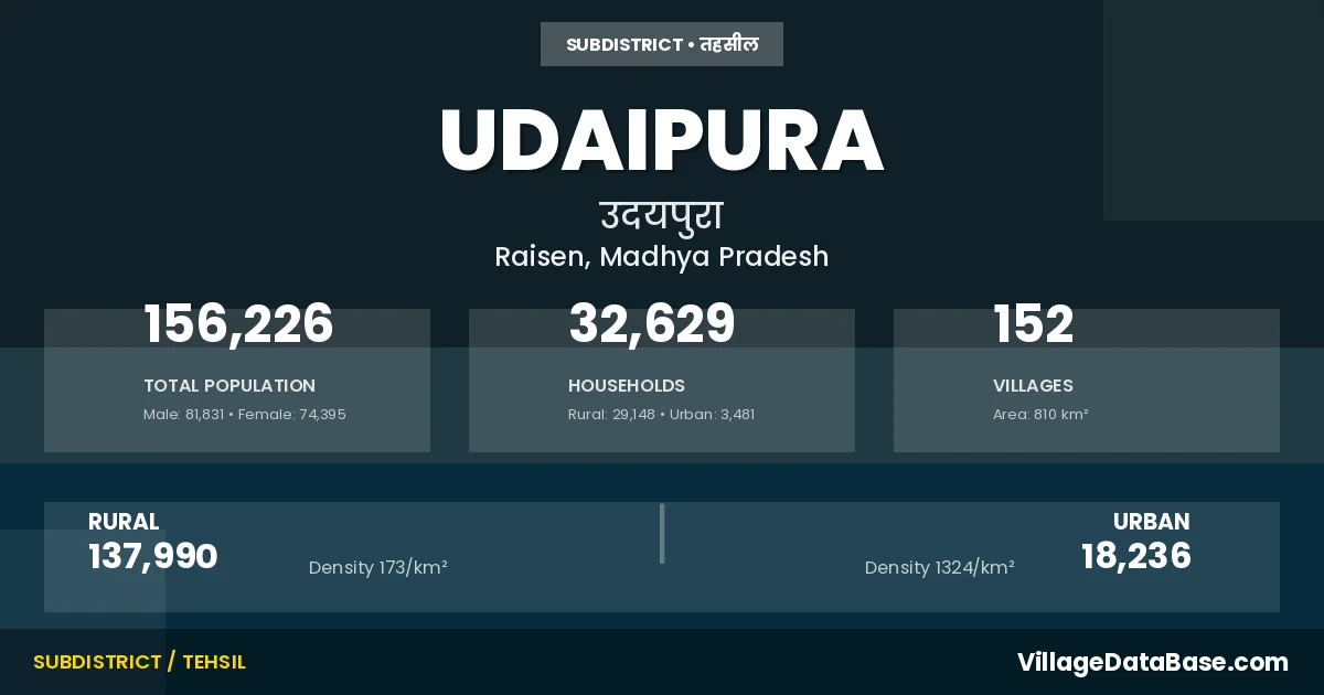 According to the 2011 census The total area of Udaipura Tehsil is 810 km², with a population of 156226 people. The population density is 193 inhabitants per square kilometre, and there are approximately 32629 houses in the sub district.