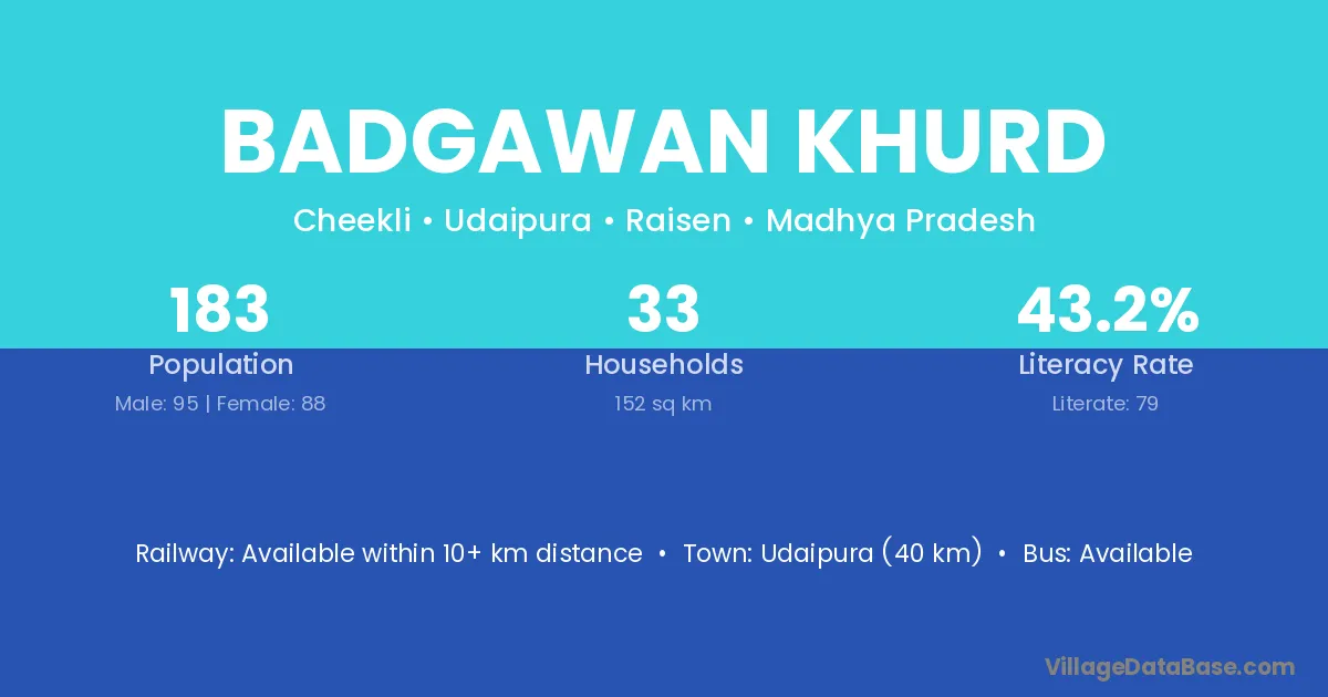 Udaipura (40 km) is the nearest town to Badgawan Khurd village for major economic activities and is located approximately 40 km away.
